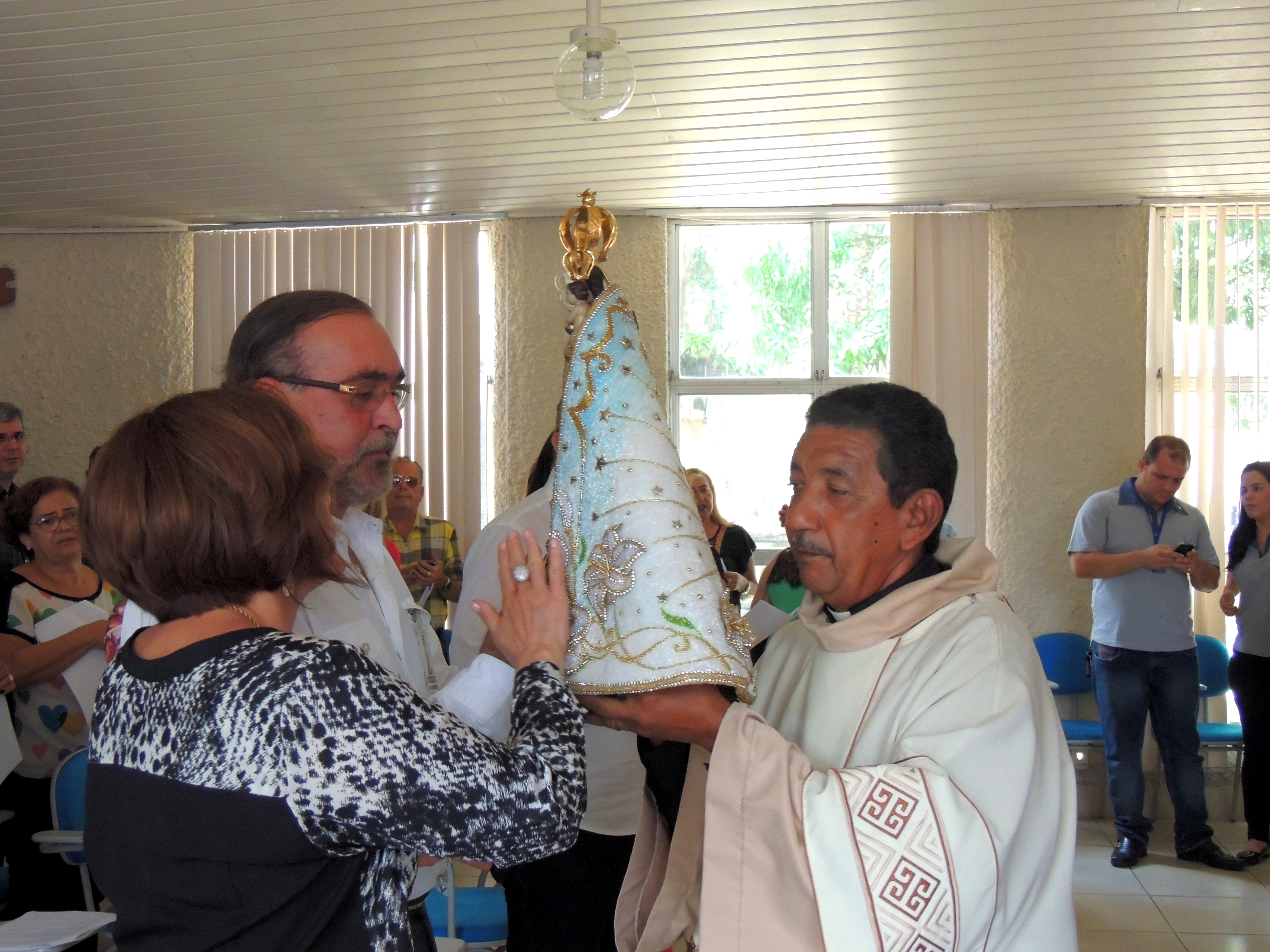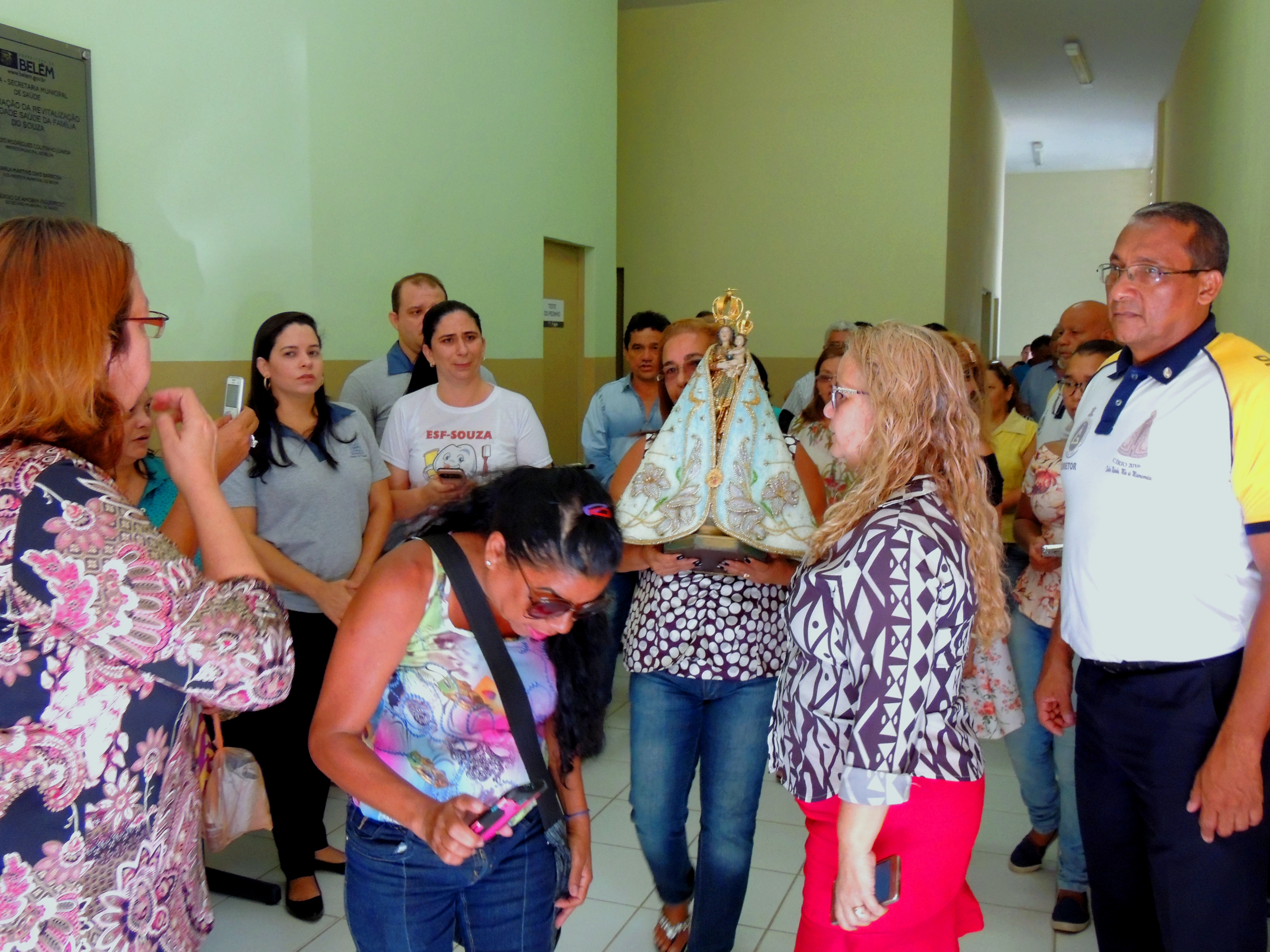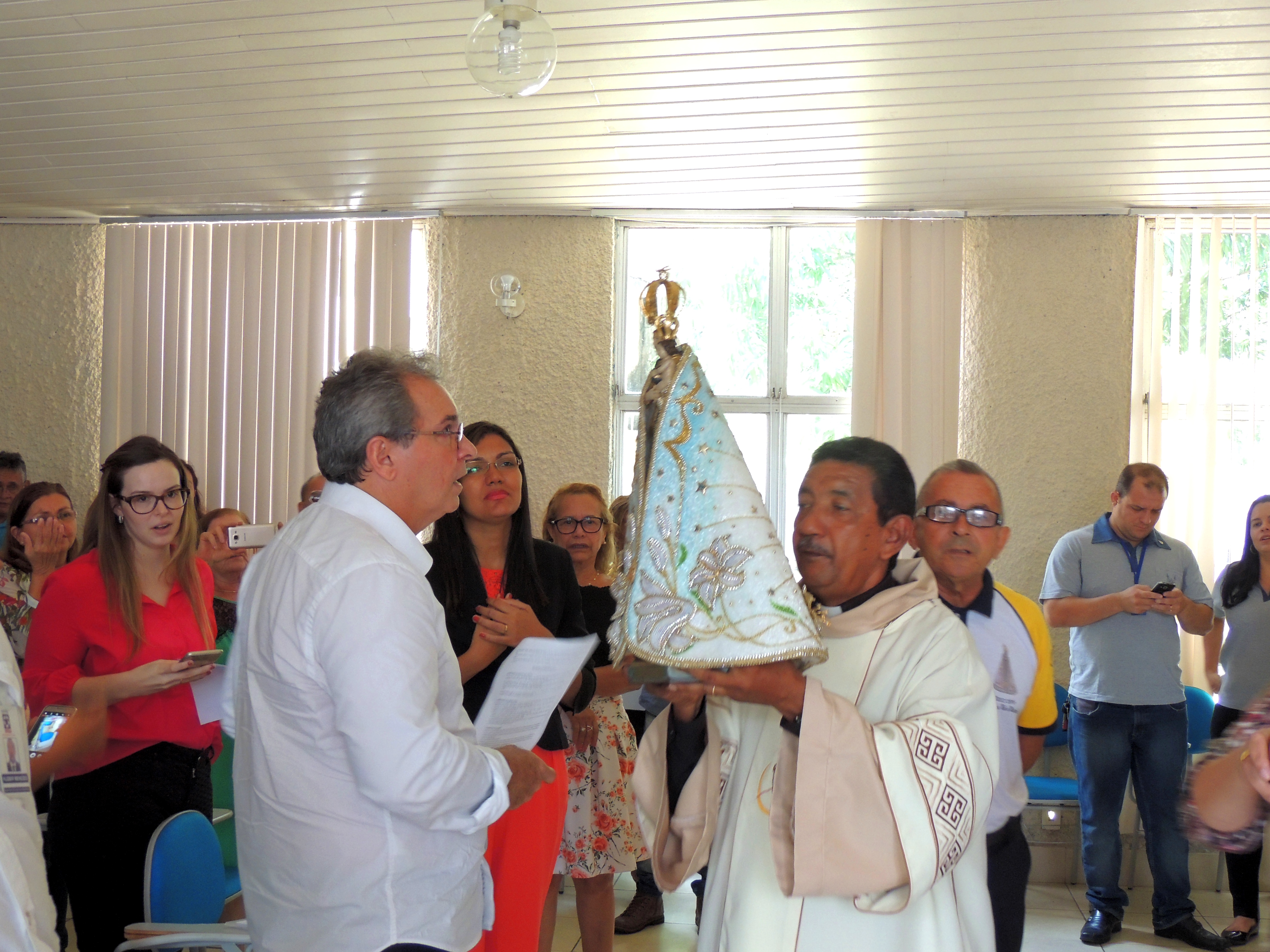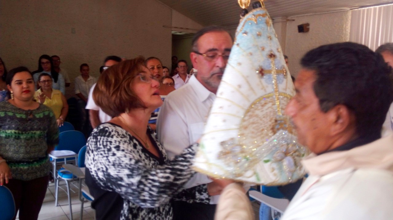 Na chegada ao hall de entrada da Setran, a imagem da santa foi recebida com muita emoção pela senhora Lastênia Menezes, esposa de Kleber Menezes, Secretário de Transportes, que a conduziu até o local da missa.