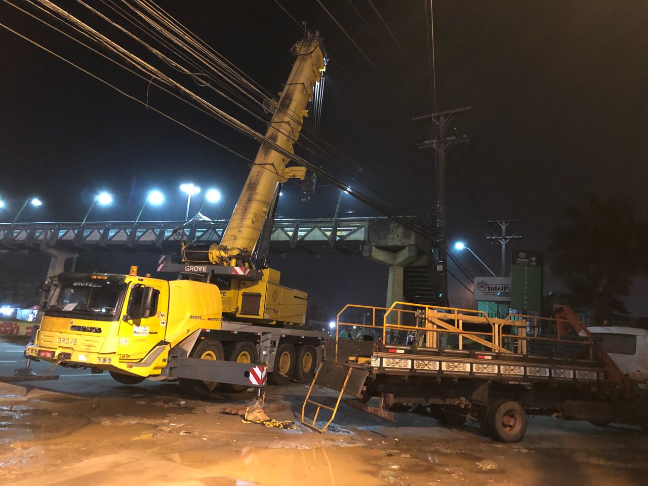 “Partimos para outra estratégia que garantisse a estabilidade da estrutura com a utilização de um guindaste de 100 toneladas, que ficará estaiado, segurando a estrutura, para que a gente possa construir uma passarela nova que será instalada em 60 dias”, garantiu Kleber Menezes. A operação, conduzida diretamente pelo Secretário de Transportes, foi acompanhada por técnicos da Defesa Civil, que aceitaram a alternativa, evitando-se, desta forma, a interdição da passarela.