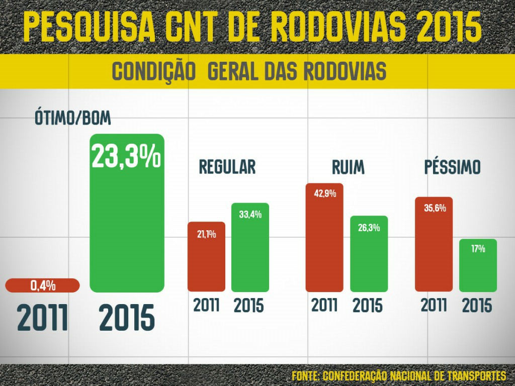 A pesquisa CNT já apontava em 2014 a crescente melhoria. Na pesquisa do ano passado, a avaliação “bom/ótimo” estava em 10,4%, dobrando agora para 23,3%. Já a avaliação negativa das condições das rodovias, somando ruim e péssimo, caiu pela metade: de quase 80% para pouco mais de 40%.