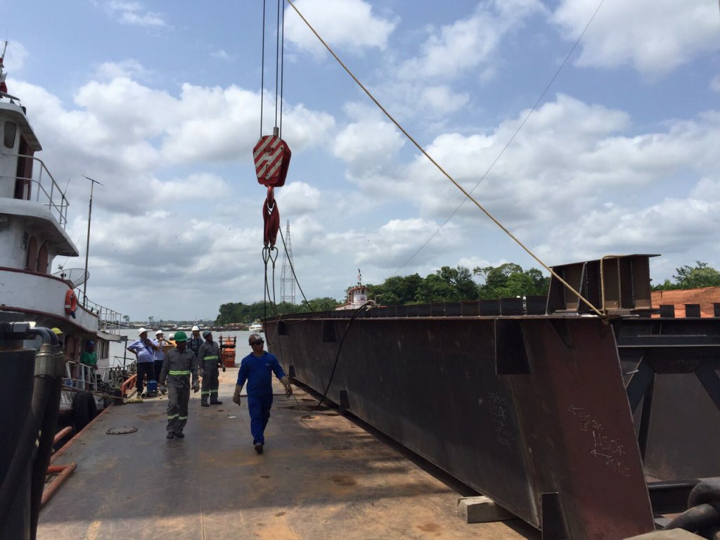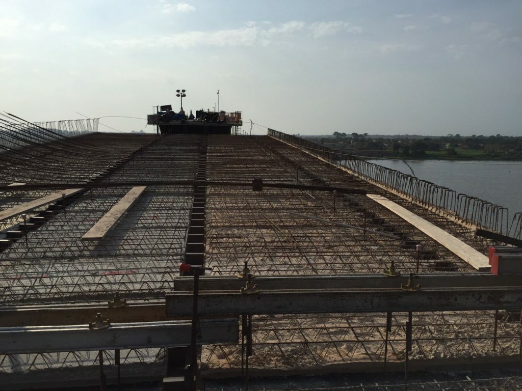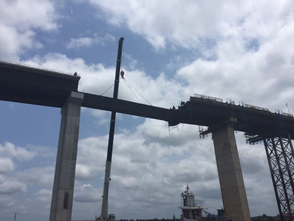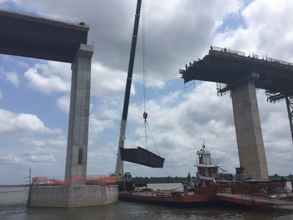 Desde a última audiência pública ocorrida em Moju as obras da ponte seguem em plena atividade e a Setran esta semana conclui uma parte importante da obra. O lançamento de prelagem e armação da laje do tabuleiro do Módulo 6 e lançamento das vigas metálicas 3 e do Módulo 5, que se trata do último vão sendo fechado da ponte.