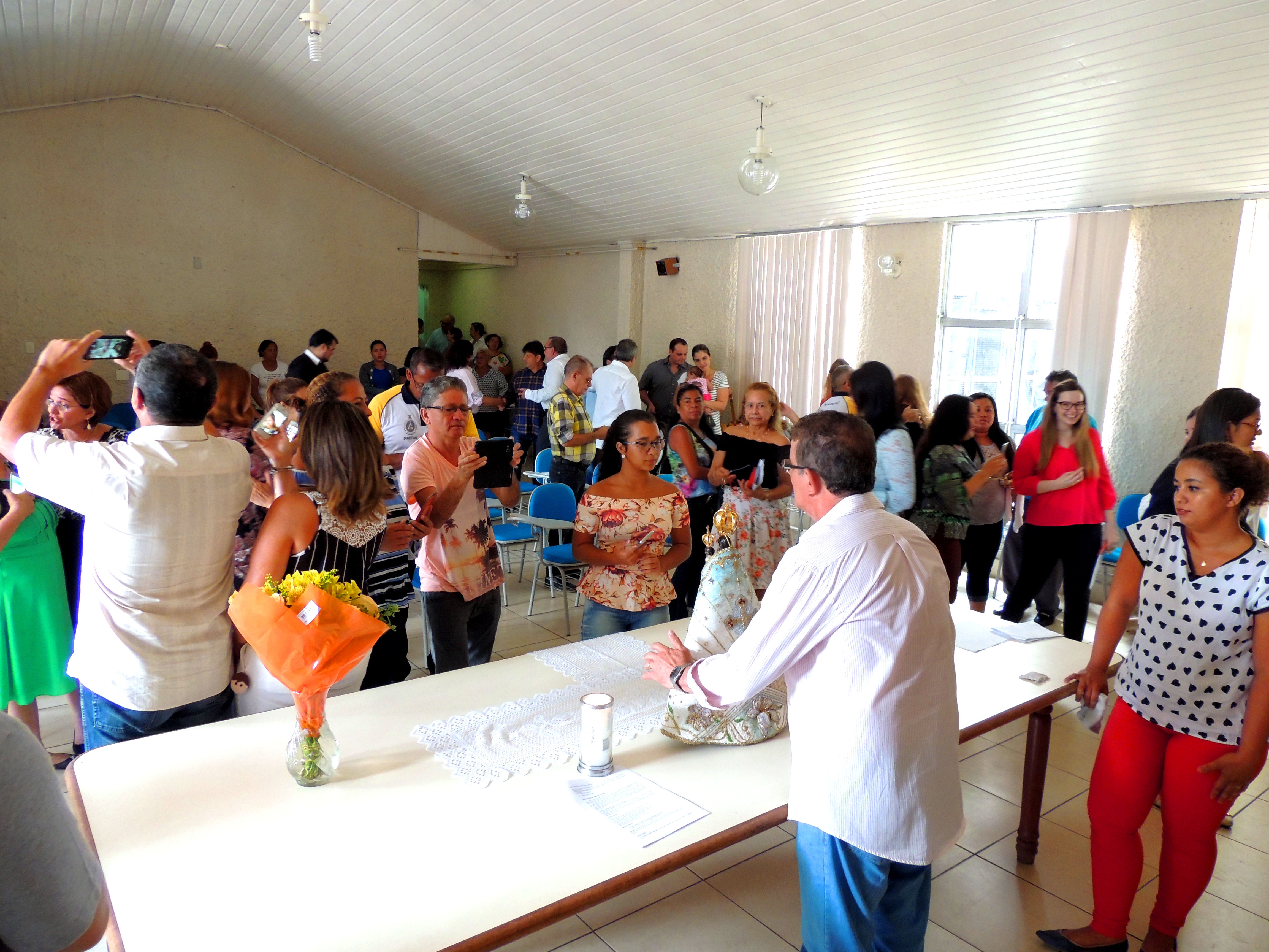 Na chegada ao hall de entrada da Setran, a imagem da santa foi recebida com muita emoção pela senhora Lastênia Menezes, esposa de Kleber Menezes, Secretário de Transportes, que a conduziu até o local da missa.