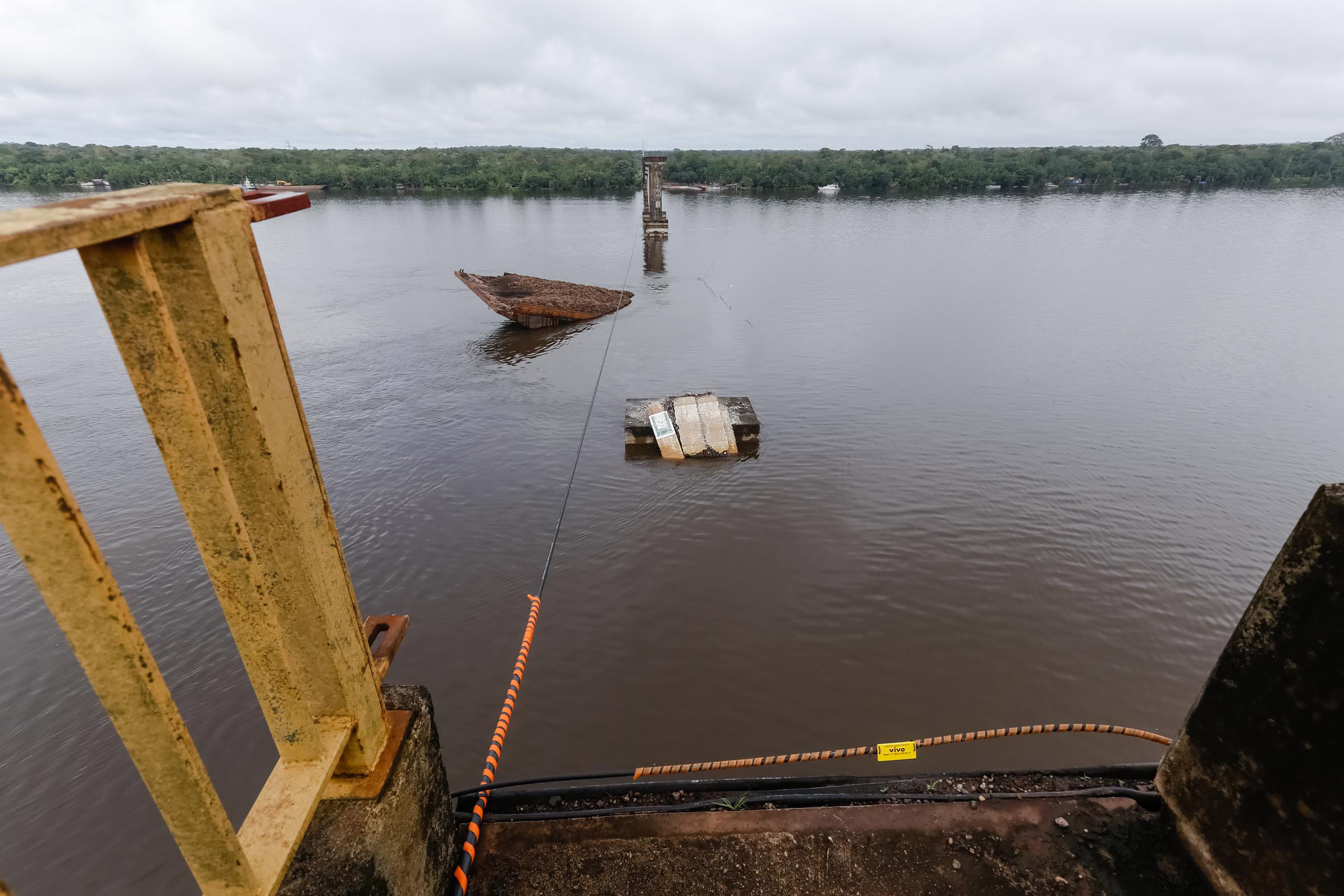 Duas equipes de mergulhadores iniciaram o trabalho de amarração dos escombros da ponte Rio Moju nesta terça-feira (30). Farão, também, a amarração de 24 cabos de aço nos destroços da balsa e na estrutura que desabou para que, assim, possam movimentar o tabuleiro de 80 metros e 850 toneladas. Toda a ação é acompanhada pela Secretaria de Estado de Transportes (Setran).