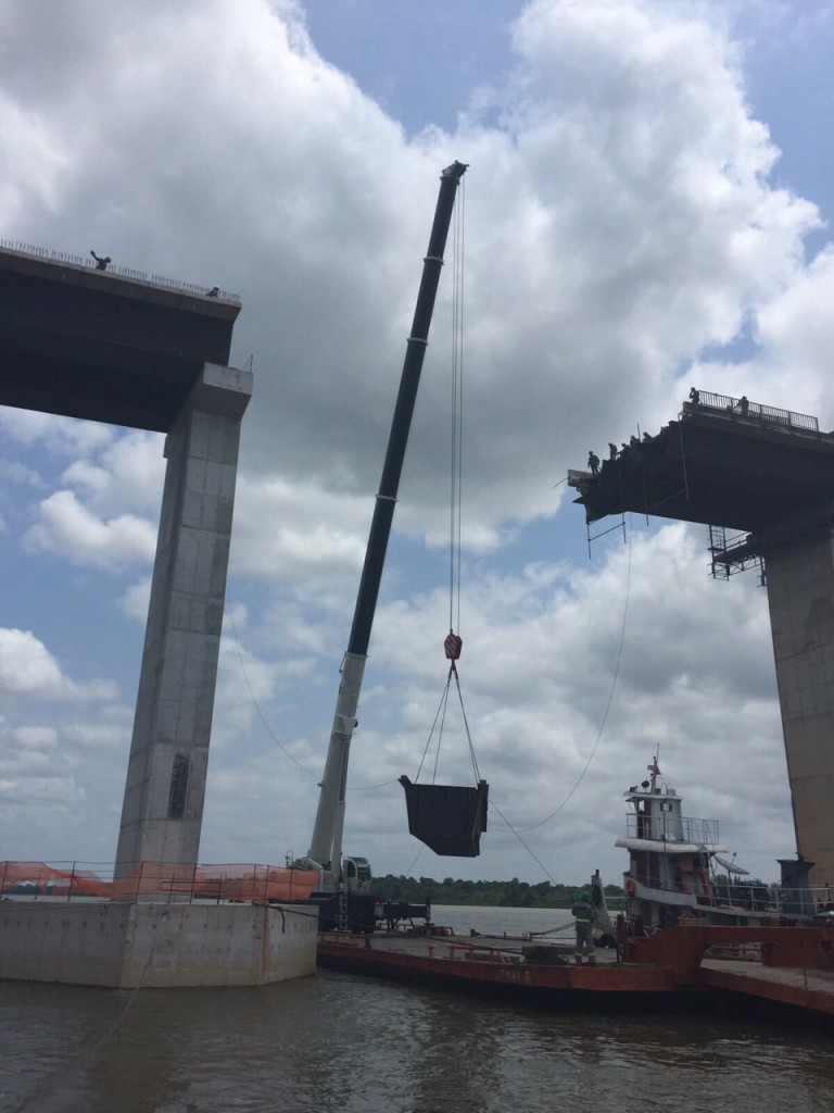 Desde a última audiência pública ocorrida em Moju as obras da ponte seguem em plena atividade e a Setran esta semana conclui uma parte importante da obra. O lançamento de prelagem e armação da laje do tabuleiro do Módulo 6 e lançamento das vigas metálicas 3 e do Módulo 5, que se trata do último vão sendo fechado da ponte.